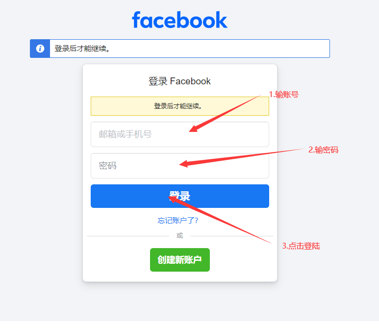 2.使用您的账号和密码登录 Facebook 账号。如下图所示: