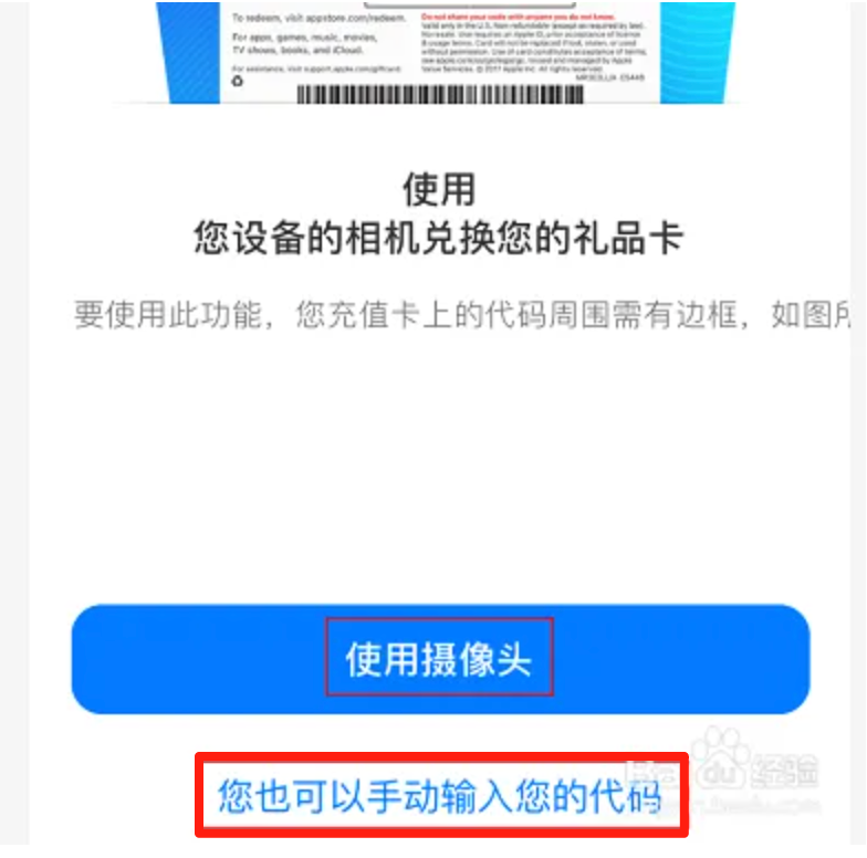 4.在弹出的兑换代码对话框,点击使用摄像头拍摄兑换礼品卡或手动输入礼品卡的代码进行兑换即可。